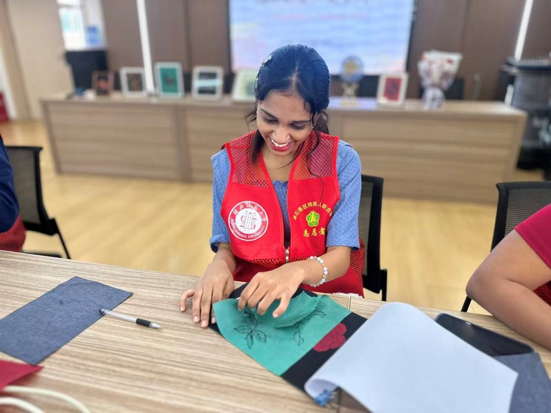 在实践制作环节,来自湖北师范大学国际教育学院的留学生们与社区听障、肢残等人士混合编组,形成了中外搭档健残互助的温馨画面。在湖北师范大学国际教育学院辅导员孙悦的带领下,留学生们表现出极高的热情与耐心。现场的阳光助残志愿者导师们则开展一对一的精准指导,从执笔手法、熨烫力度到图案勾勒,一步步细致教学。
