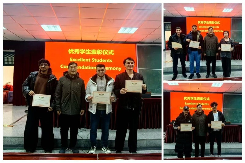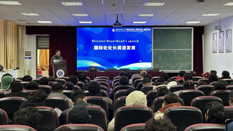 三是寒假特色活动部署与倡议,学院精心策划了包饺子迎新年、国际美食节、社区义务教英语及体育竞技等多项活动,鼓励同学们积极参与,在丰富假期生活的同时,增进文化交流,提升综合素养。四是学期总结及优秀学生表彰,对本学期学院各项工作成效进行梳理,对表现突出的学生予以表彰鼓励。大会对本学期通过HSK4考试的学生表示热烈祝贺,肯定了他们在汉语学习中付出的努力与取得的进步,鼓励全体学生以他们为榜样,勤学不辍、精益求精。同时,大会对荣获湖北省政府奖学金的6名学生及2名优秀迎新志愿者进行隆重表彰,院长龚波为获奖学生颁发荣誉证书,称赞他们在学业成绩、志愿服务等方面展现出的优良风貌,希望获奖学生珍惜荣誉、再接再厉,充分发挥模范带头作用,也督促全体学生主动向优秀看齐,在学习上刻苦钻研,在实践中勇于担当,在奉献中提升自我。