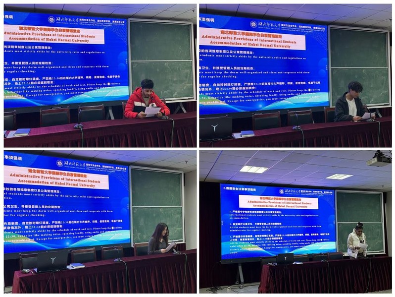 会上,主持人孙悦围绕四大核心内容,对期末及寒假期间的重点工作进行详细部署,为师生们明确了具体要求。一是离校与返校相关安排,详细告知了寒假时间节点、离校请假流程及不同情况学生的返校要求,尤其强调了离境学生的体检、居留许可办理等关键事项,提醒同学们严格遵守时间规划,提前做好行程安排。二是假期安全注意事项,结合冬季假期特点,对安全工作进行全面细致强调。她着重指出,要严守宿舍安全规定,严禁使用违禁电器、明火,杜绝私自转租留宿行为;时刻警惕溺水风险,远离危险水域,不参与各类危险水上活动;强化防诈骗意识,对虚假返利、冒充公职人员等诈骗手段保持高度警惕,做到不轻信、不透露、多核实;重视消防安全,熟悉消防设施位置,掌握基本逃生技能;保障人身安全,远离不良场所,杜绝酗酒、涉毒、打架斗殴等行为,严禁非法就业;遵守交通规则,骑乘电动自行车需佩戴头盔,杜绝无证驾驶、酒后驾驶,严格遵守机动车相关法律法规;规范出行管理,外出务必履行审批手续,全程做好个人防护;严格遵守黄石市烟花爆竹禁放规定,自觉维护公共安全与环境秩序,共同守护平安假期。同时,与会留学生现场阅读《湖北师范大学国际学生安全告知书》,深入了解相关法律法规及安全要求,并郑重签署姓名,切实筑牢自身安全防线。