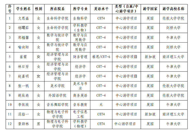 根据省教育厅及学校相关工作安排,各学院已完成本单位推荐学生的评选与公示工作,相关学生材料按要求提交至学校后,经学校资格初审,现将2026年度“湖北高校优秀大学生海外游学计划(中心游学项目)”初审通过学生名单予以公示,接受全校师生监督。