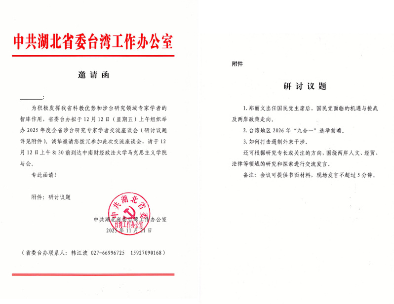 2025年12月12日,“2025年全省涉台研究领域专家学者交流座谈会”在中南财经政法大学顺利举行。本次会议由湖北省人民政府台湾事务办公室与中南财经政法大学联合主办,来自全省涉台研究领域的多位专家学者齐聚一堂,就两岸关系发展趋势、政策走向及外部环境影响等议题进行深入交流。湖北师范大学高度重视此次学术活动,派出由经济管理与法学院、外国语学院教师组成的代表团队参会,成员包括黄梅、李小康、颜龙龙、江代维、马子涵、肖晶等六位教师。