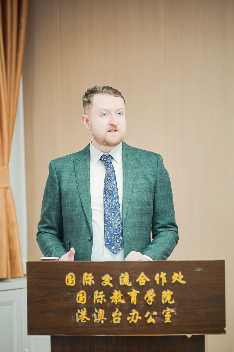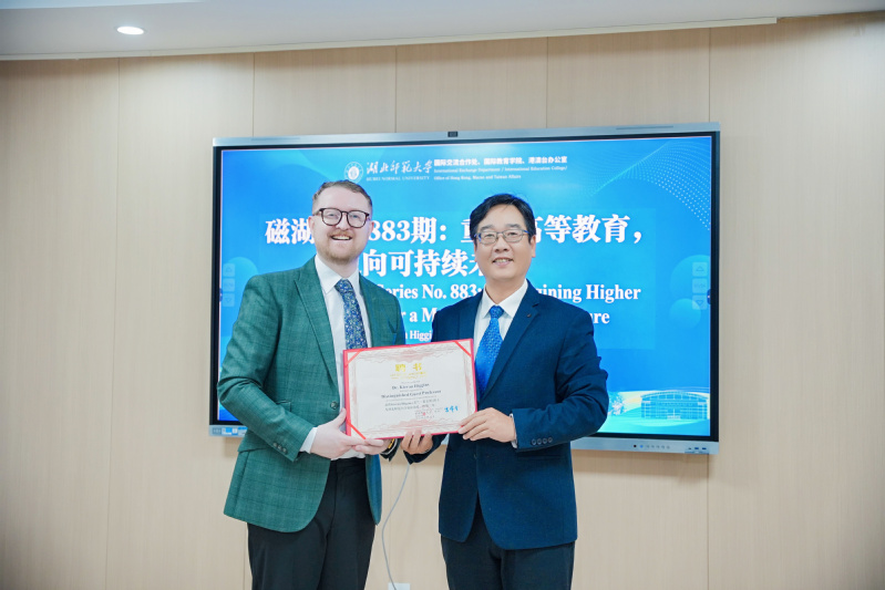 3月26日上午,国际教育学院在资环大楼7521会议室举行客座教授聘任仪式,聘请英国奥斯特大学基兰·希金斯(Kieran Higgins)博士担任我校客座教授。国际交流合作处处长、国际教育学院院长龚波教授主持仪式。聘任仪式后,希金斯博士应邀作了题为“重构高等教育,迈向可持续未来”的学术报告。来自英国卡里克弗格的学生代表团,以及我校教育科学学院、城市与环境学院等单位的师生代表参加了此次活动。